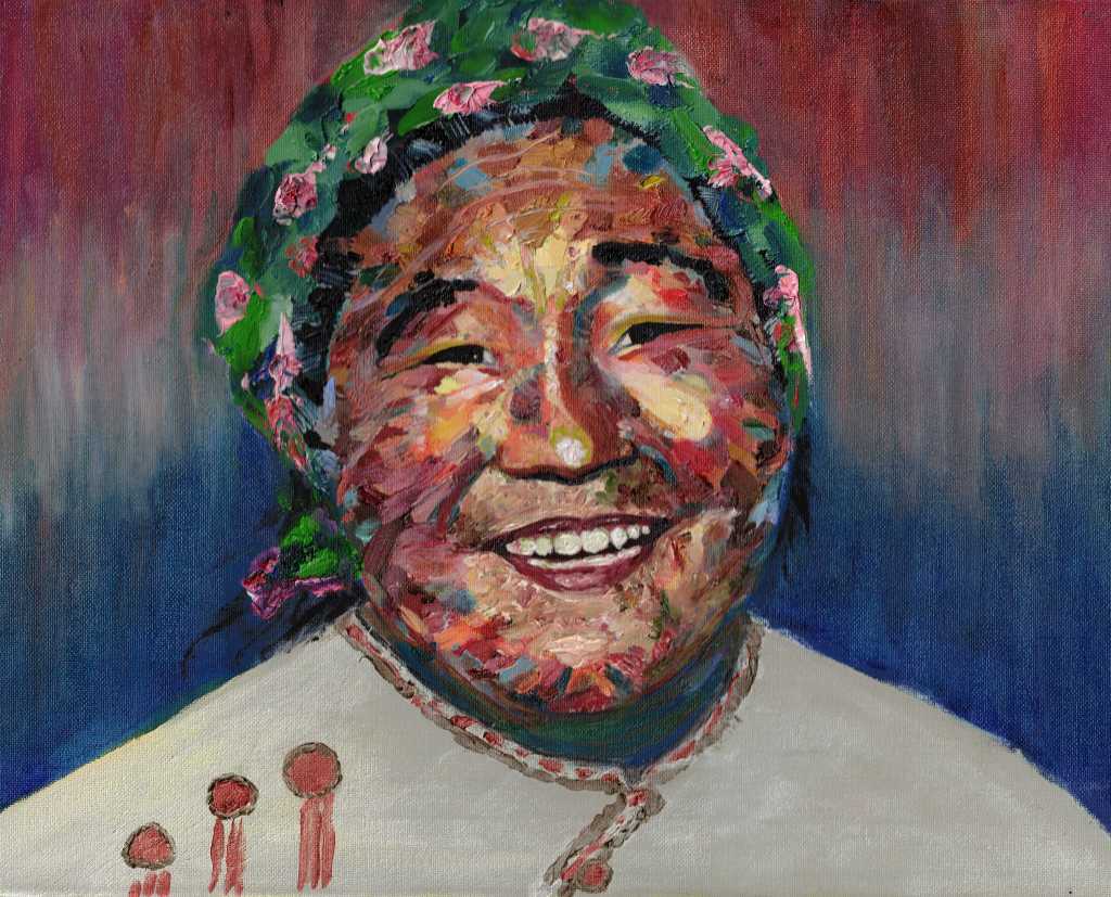 I decided to have another go at the lovely, grinning Mongolian lady, but in a different style (kind of a made up impasto sort of).