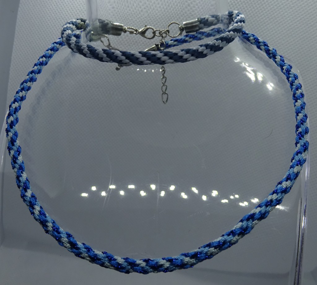 Kumihimo – this is the art of Japanese braiding, whereby using a disk cut with notches and cord lovely braids can be produced. A step up is to include beads to add glamour and flare. Once you have ironed out the beginners bugs it is very relaxing – I do it on trains, waiting for something, watching TV…